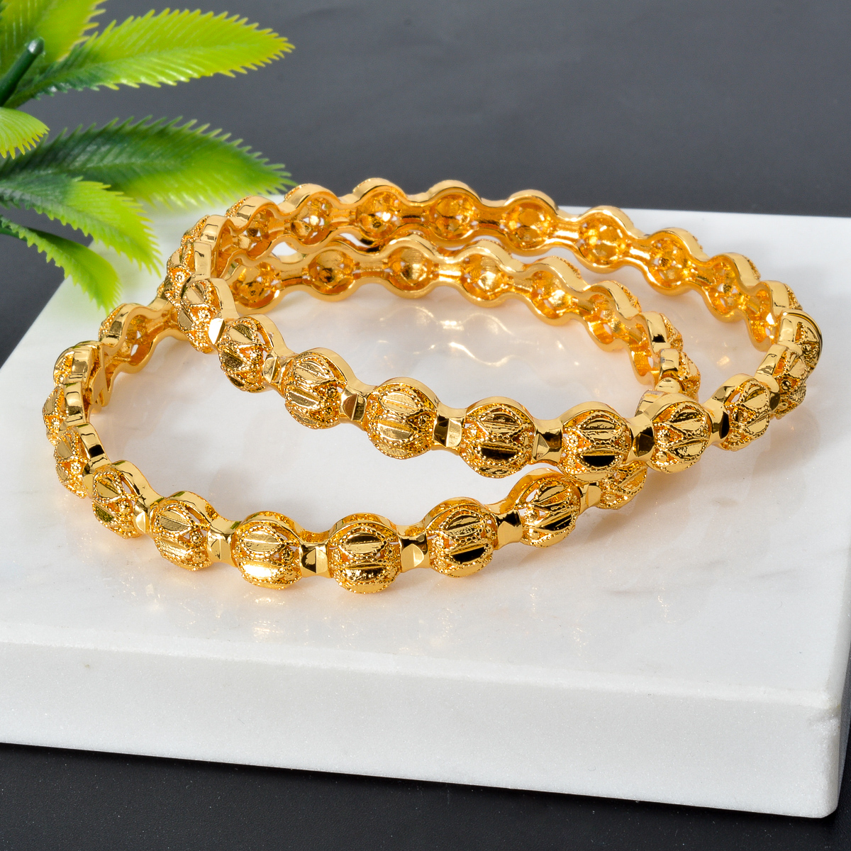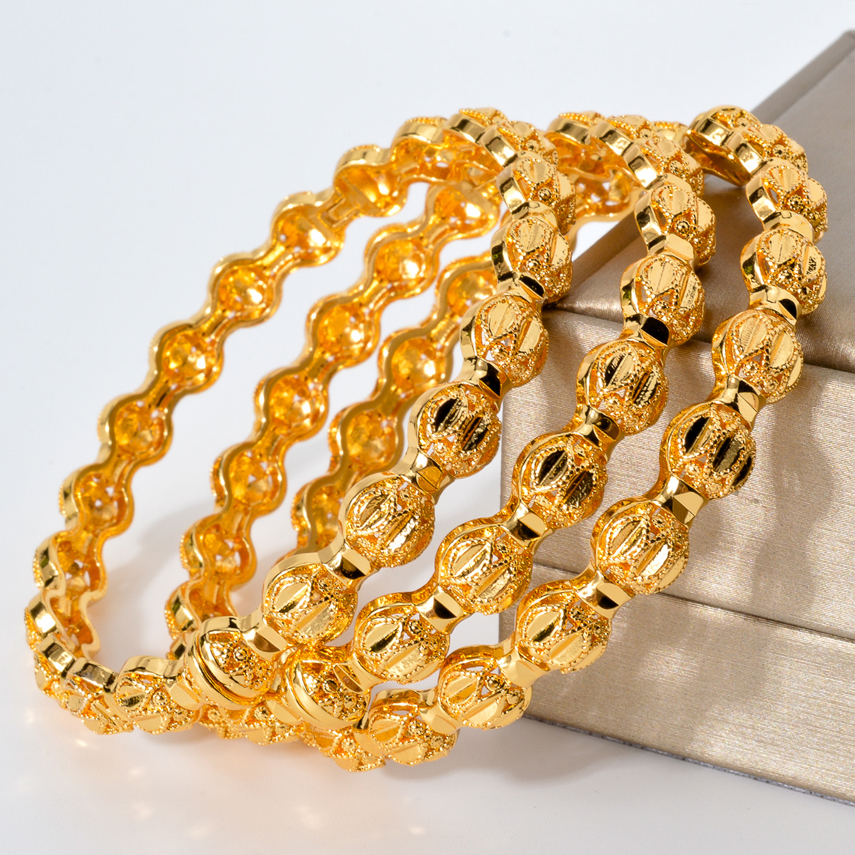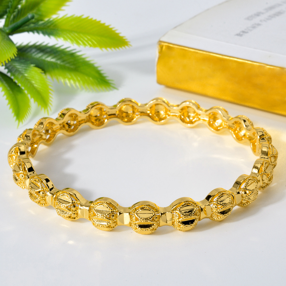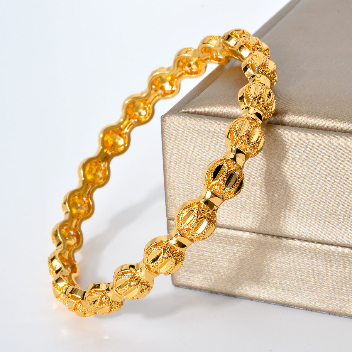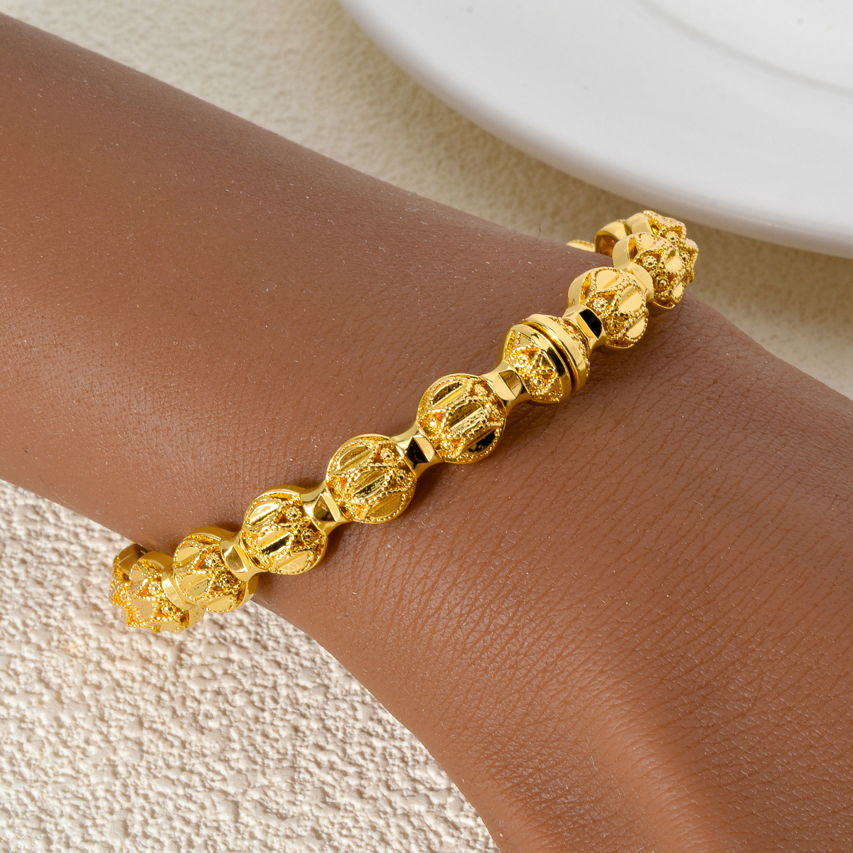 手镯表面有精致的花纹和圆形装饰,整体设计精美,散发着华丽的光泽,日常传统首饰佩戴。